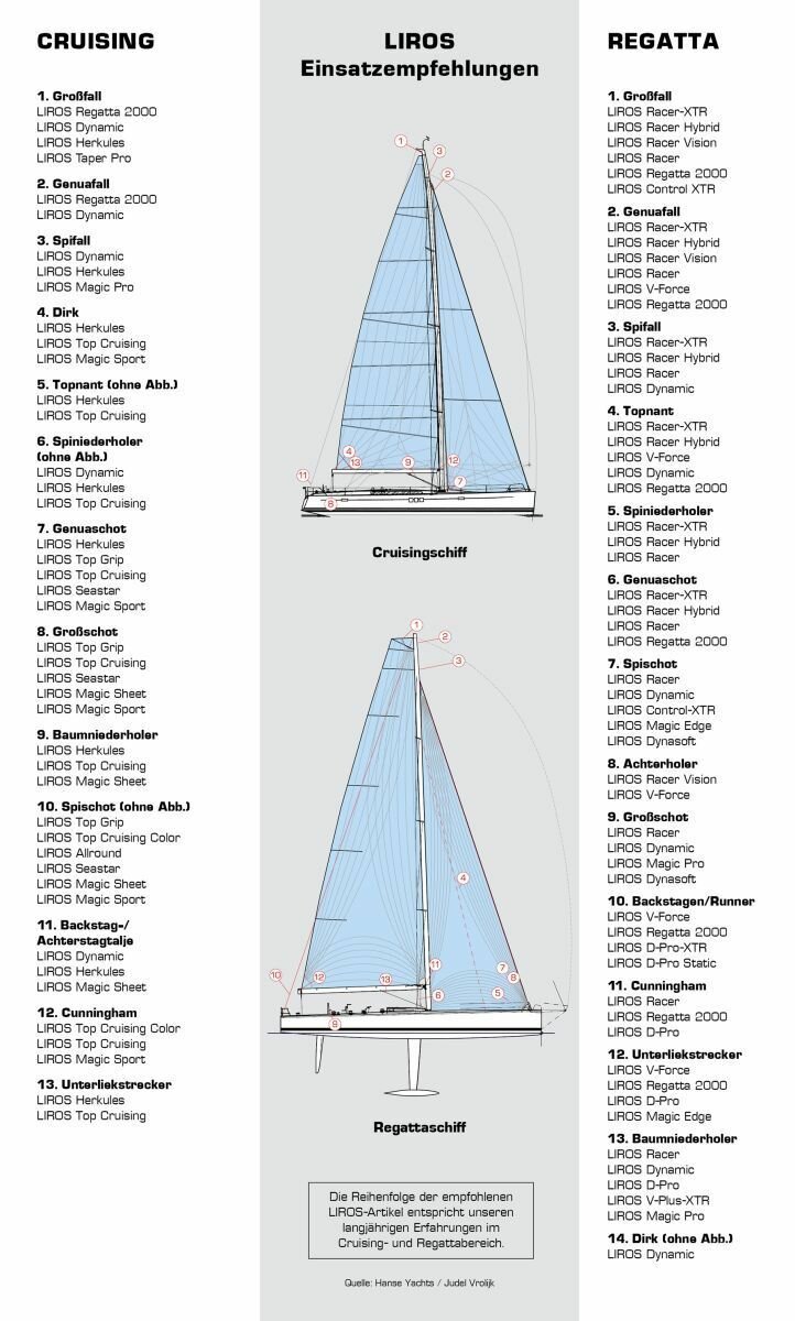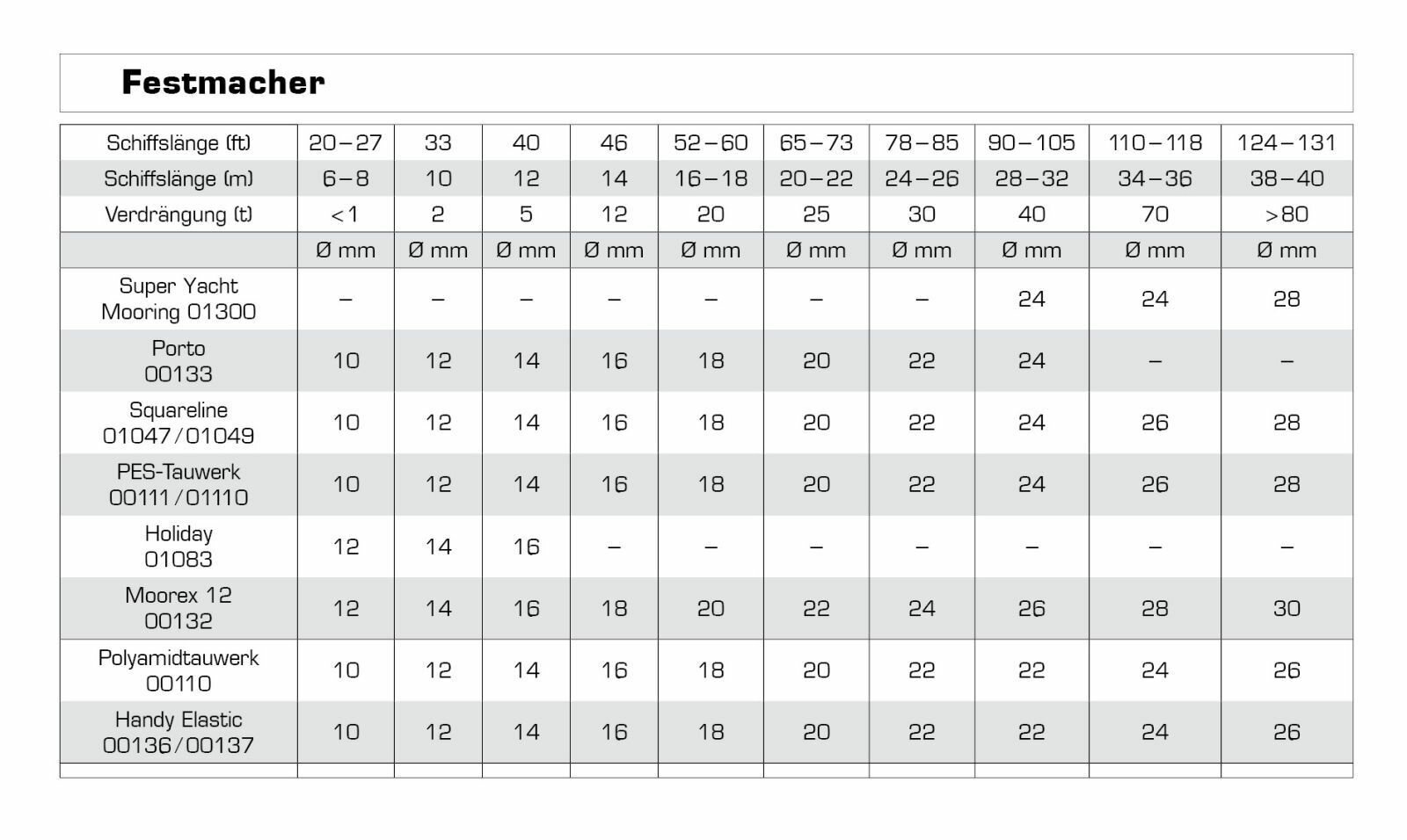Die Wahl der richtigen Schleppleine sollte auf ein Seil mit hoher Dehnung fallen. Die Länge sollte dabei mindestens die 3-fache Schiffslänge betragen. Bei ruhiger See reicht zwar eine kürzere Leine aus, jedoch empfehlen wir für den universellen Einsatz die 3-fache Schiffslänge. Tauwerk aus Polypropylen ist schwimmfähig und verhindert, dass sich die Leine in der Schraube des Motors verfängt. (Wir empfehlen LIROS Nautic, LIROS Lirolen oder LIROS Squareline PP)