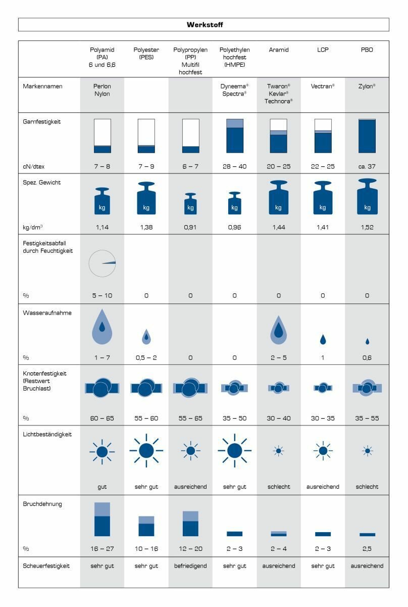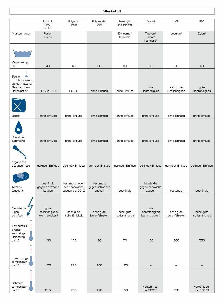 Hier finden Sie technische Informationen über die physikalischen Eigenschaften von Synthetikfasern wie beispielsweise UV-Beständigkeit oder Scheuerbeständigkeit.