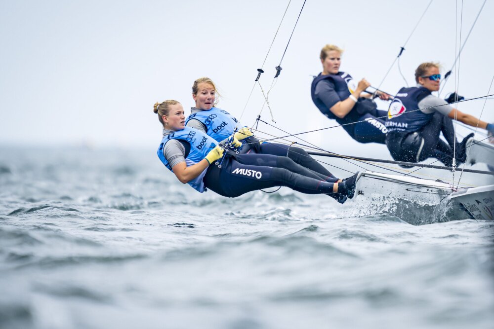 Über ihren ersten Kieler-Woche-Sieg jubelten Marla Bergmann und Hanna Wille vom Mühlenberger Segel-Club im Olympia-Skiff der Frauen. Das deutsche 49erFX-Duo hat sich seit Platz elf bei der Kieler Woche 2022 enorm gesteigert und sich für die olympische Testregatta in Marseille und die Weltmeisterschaft aller olympischen Disziplinen im August in Den Haag viel vorgenommen. Steuerfrau Marla Bergmann sagte: „Es war sicher nicht ideal, mit einem Frühstart in die Kieler Woche einzusteigen. Wir mussten danach etwas zurückhaltender agieren. Im Finale haben wir uns dann für ‚all in‘ entschieden, sind volles Risiko gegangen und hatten den besten Start.“ Nur einen Punkt hinter Bergmann/Wille beendeten Maru Scheel und Freya Feilcke vom Kieler Yacht-Club die Kieler Woche. Die gute Zusammenarbeit unter den deutschen 49erFX-Crews hob Hanna Wille hervor: „Wenn wir das Nationenticket für Olympia 2024 lösen wollen, müssen wir zusammenarbeiten und das funktioniert auch sehr gut.“