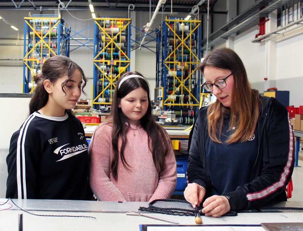 Nach einer kurzen Firmenvorstellung und einem Rundgang durch alle Abteilungen hatten die Mädels Gelegenheit zusammen mit erfahrenen Seilerinnen einen Pferdeführstrick und Schlüsselanhänger zu basteln.