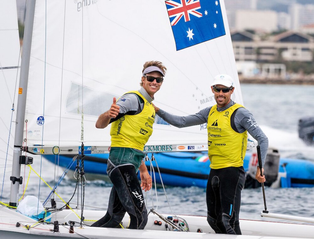 Der zweite Amwindkurs war erfolgreich und an der letzten Markierung ließen sich die beiden auf keine Spielchen mit den Italienern ein und verwiesen diese auf den zweiten Platz. Das Rennen war vorbei und die Australische Flagge wurde gehisst. Die Jungs genossen den Champagner auf dem Podium."