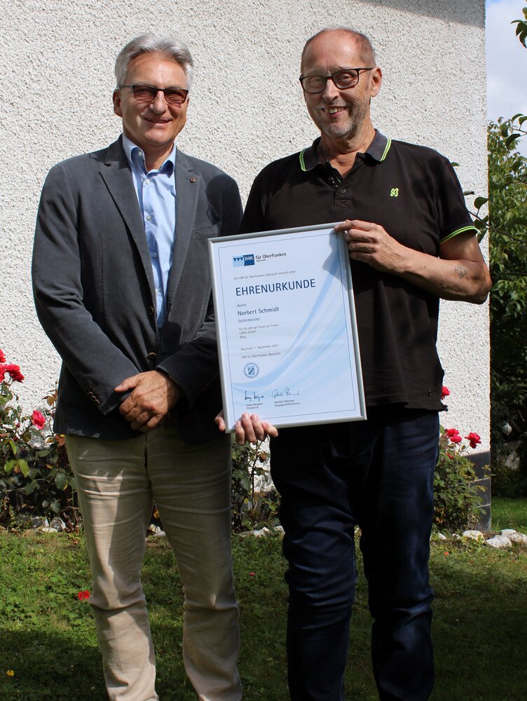 Managing director Karl Friedrich Rosenberger thanked him and handed him a gift from the company and the honorary certificate of the Chamber of Industry and Commerce of Upper Franconia.